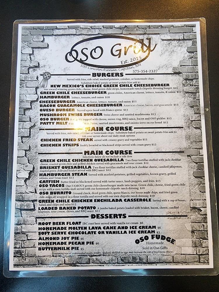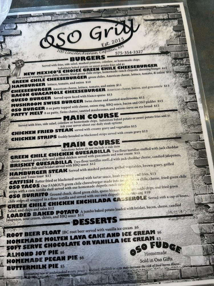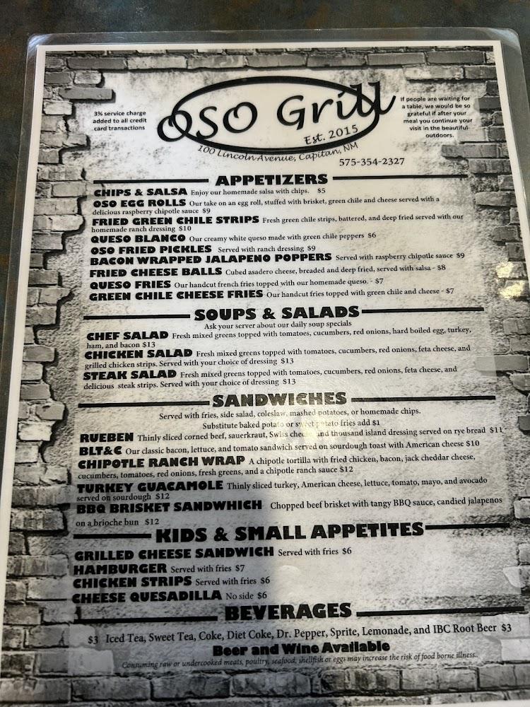 Welcome to Oso Grill, your go-to cafe and grill restaurant located at 100 Lincoln Ave, Capitan, NM. Enjoy a relaxed atmosphere as you savor our delicious local specialties, from hearty lunches to delightful dinners. With an extensive selection of beers and wines, paired with our mouthwatering desserts, there's something for everyone. Whether you prefer dining in, takeout, or drive-thru, our quick service ensures you never miss a beat. Oso Grill is family-friendly, featuring accessible facilities and a kids' menu. Join us for a memorable meal where quality meets comfort! Call us today at +1 575-354-2327.